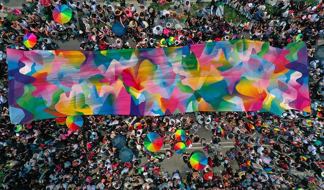 « Le drapeau arc-en-ciel est coloré tout en étant linéaire. Chaque communauté dispose de son propre drapeau, et en fin de compte, tout le monde semble être prisonnier d’une case. Avec mon drapeau, je veux montrer que nous ne sommes pas des cases ! Nous sommes tous connectés, un méli-mélo de différences. Pour cette œuvre d’art, j’ai parlé avec toute une série de personnes queers pendant la Gay Pride à Mexico City. Leurs histoires et battements de cœurs ont donné cette explosion haute en couleur. »