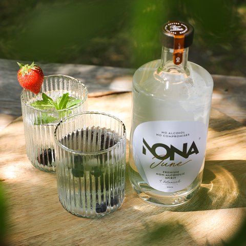 Nona June is een overheerlijk alcoholvrij alternatief voor gin. Nona betekent ‘negen’ in het Latijn, verwijzend naar het aantal gedistilleerde kruiden in deze spirit, waaronder jeneverbes, basilicum, citrus en zwarte peper.