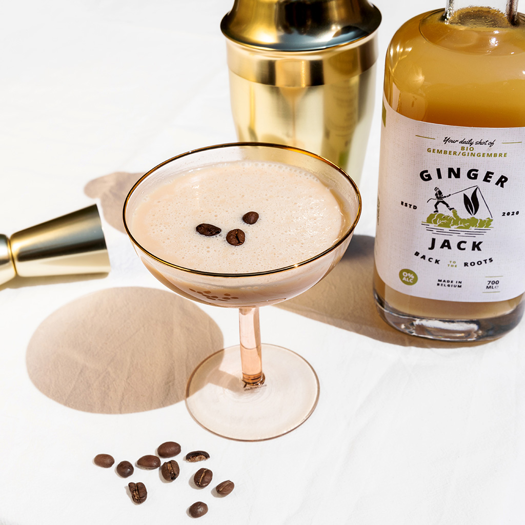 • 30 ml Ginger Jack • 30 ml espresso • 60 ml melk • 2 eetlepels gecondenseerde melk • crushed ice
