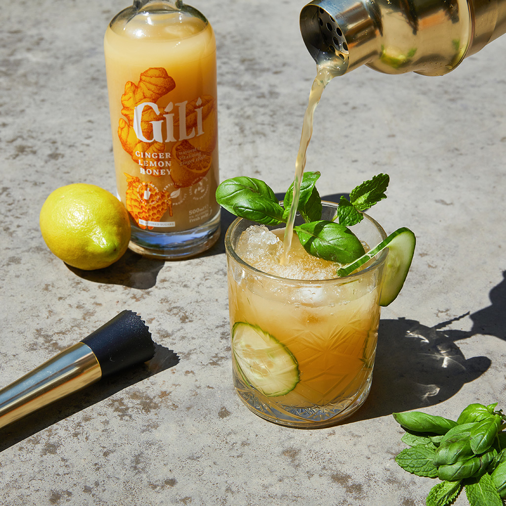 • 3 cl Gili Ginger, Lemon & Honey • 15 cl (vers) appelsap • 3 schijfjes komkommer • 5 basilicum- en muntblaadjes • ijsblokjes