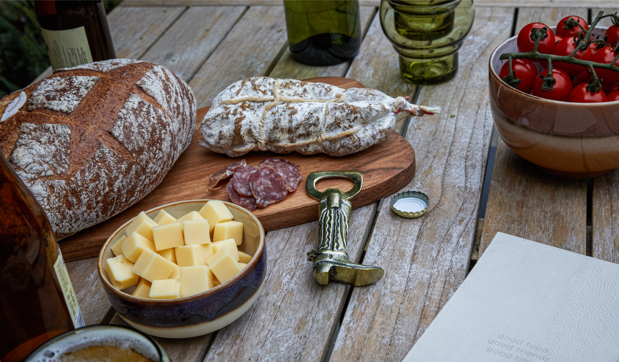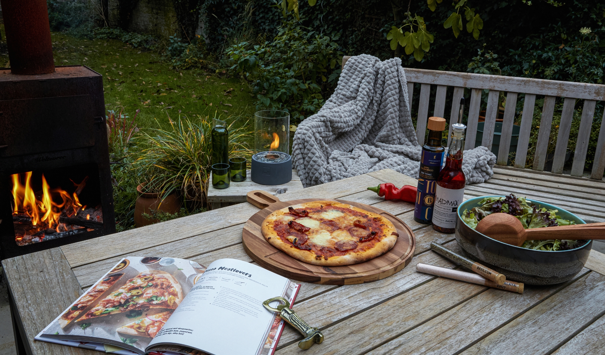 Je hebt je gasten verwittigd dat het een outdoor feest wordt en dus komen ze gewikkeld in warme jassen, dikke truien en sjaals. Jij zorgt voor dat extra laagje warmte en dat doe je door je banken en stoelen te bekleden met een veelvoud aan kussens en schapenvellen. Verder verzamel je alle dekens en plaids die je kan vinden in huis en maak je het met een buitentapijt nog gezelliger. Ook een waterkruik is een optie om de grootste koukleumen te verwarmen. En natuurlijk verzamelt iedereen het liefst rond de magische gloed van vuur. Een vuurkorf, een vuurschaal of een geïmproviseerd kampvuur is een absolute must!