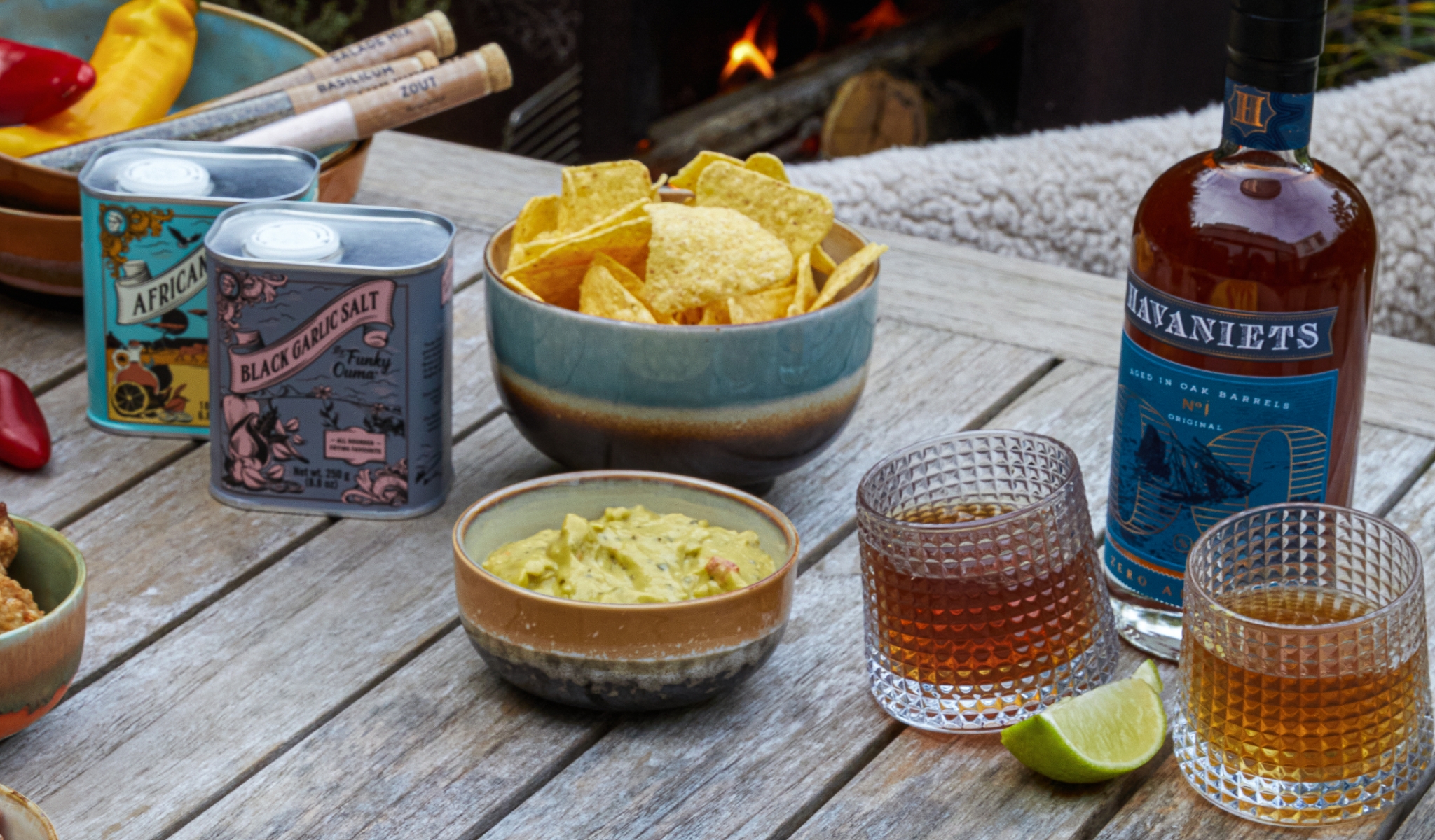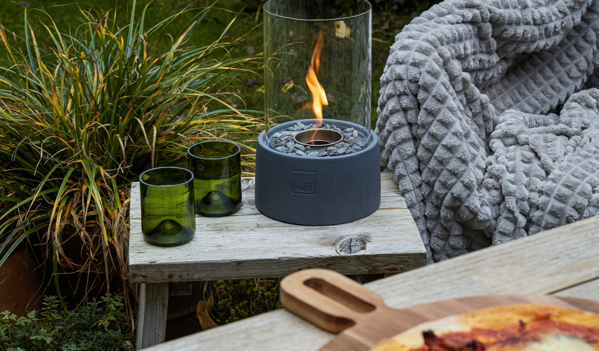 De sfeer zit ‘m niet alleen in de gloed van de kolen en de geur van het lekkers op de rooster. Dat donkere, koude terras moet ook aantrekkelijk ogen, anders blijft iedereen gegarandeerd binnen. Kaarsen, lampionnen, lichtslingers, tuinkaarsen tot fakkels: strooi royaal met sfeerlicht en maak van je tuin en/of terras een winterwonderland. Voorzie ook kleine bijzettafeltjes. Niet alleen handig voor die glazen, maar ook sfeervol voor theelichtjes.